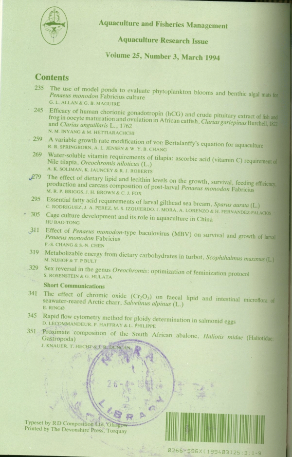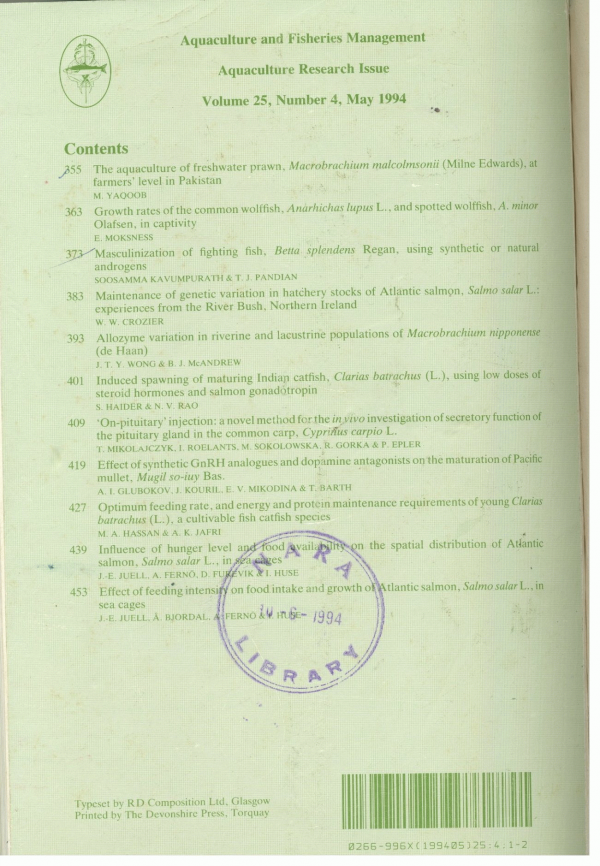 Aquaculture and Fisheries Management, Vol.25 No.1-4 (1994)